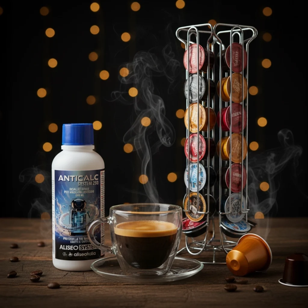 Prodotti professionali per la decalcificazione e accessori di design per organizzare il tuo angolo caffè.